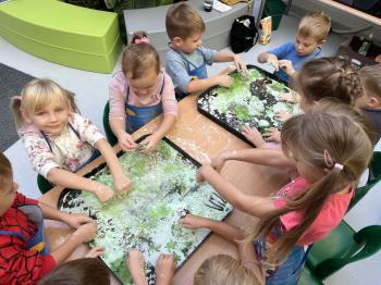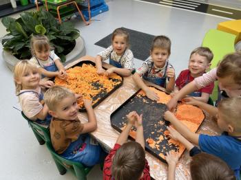 Nie zabrakło też galaretkowej krainy, pełnej śliskich, miękkich i kolorowych struktur, które zachęcały do zanurzania dłoni i eksperymentowania. Dużym hitem okazała się również Marchewkolina – dzieci dotykały marchewki w zupełnie nowej, niecodziennej postaci, tworząc własny marchewkowy świat.