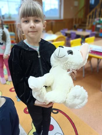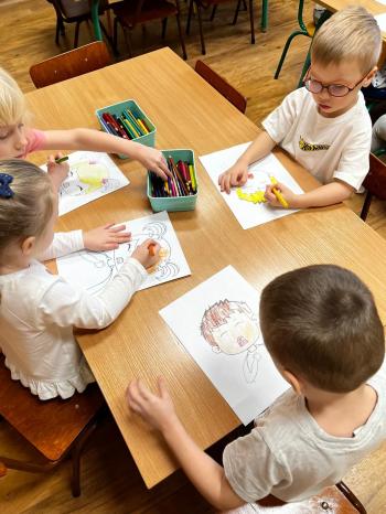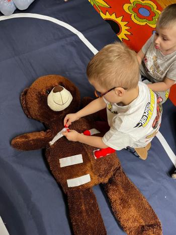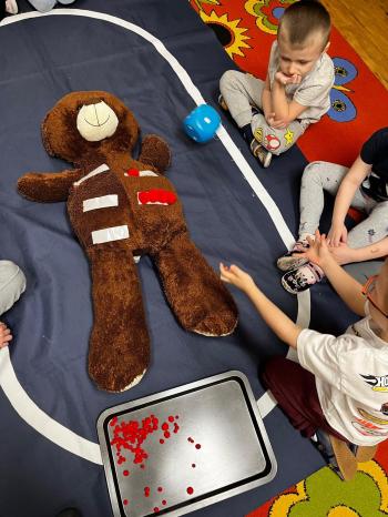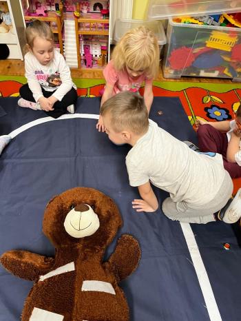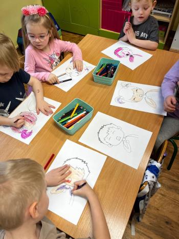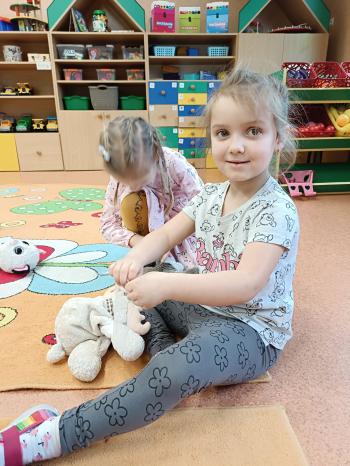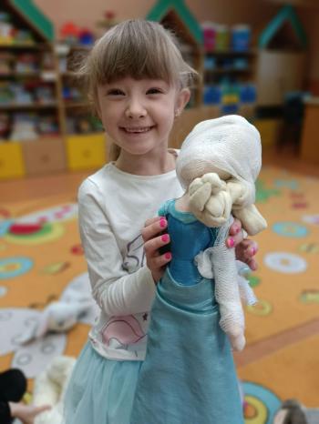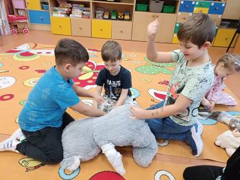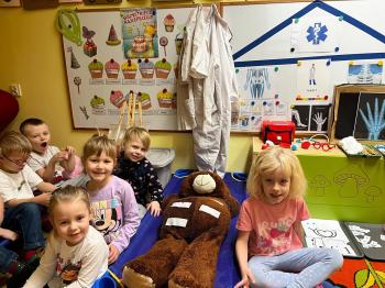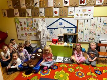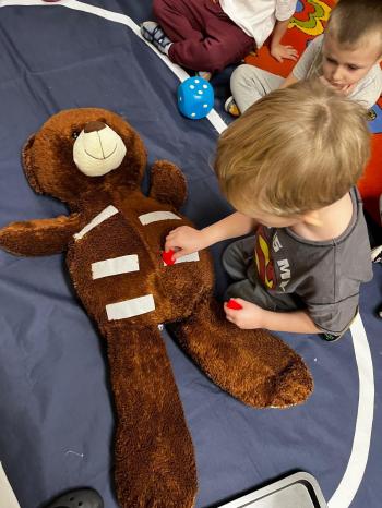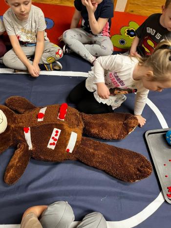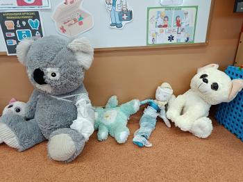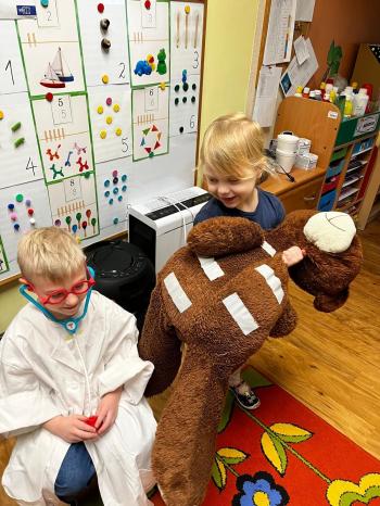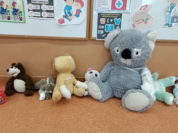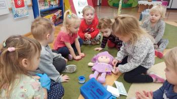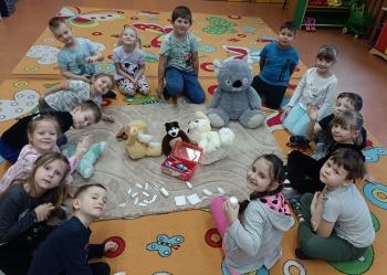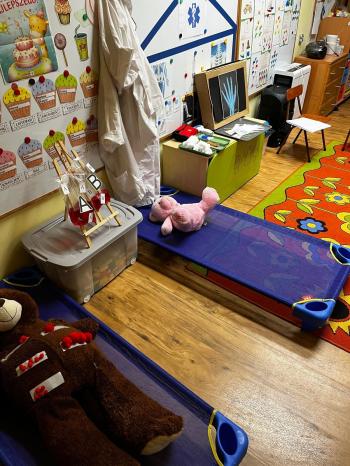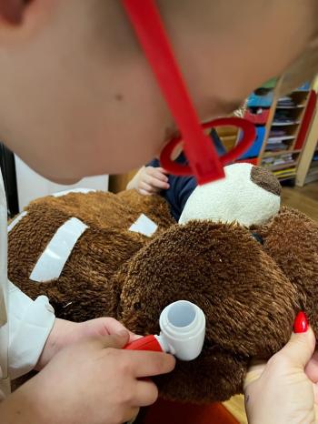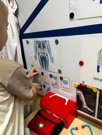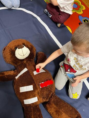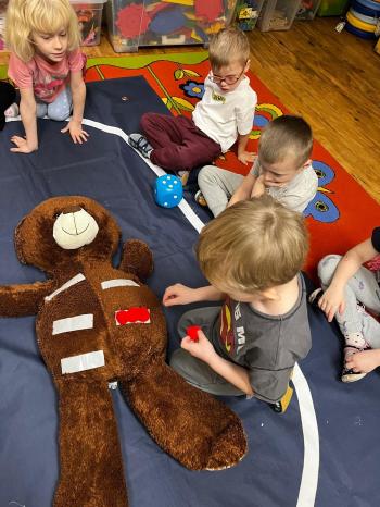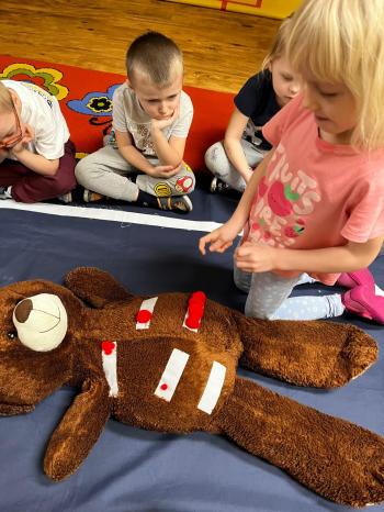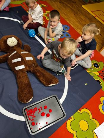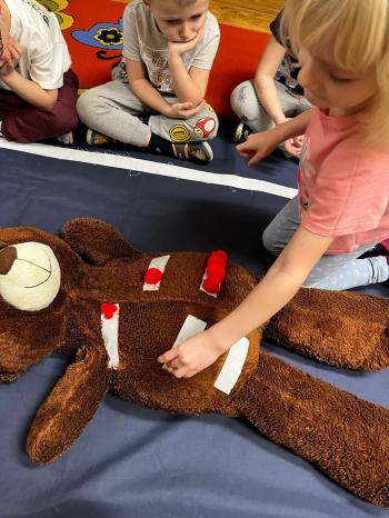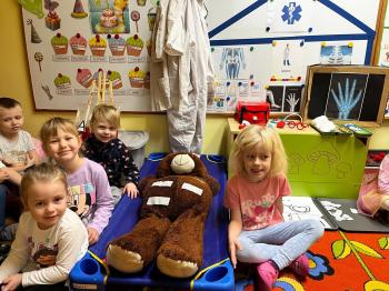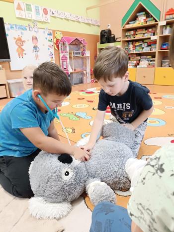 Grupa „Słoneczek” Podczas zajęć plastycznych najmłodsze przedszkolaki przeniosły się do pasjonującego świata medycyny, gdzie ich głównymi bohaterami był chory miś i lalka. „Słoneczka” z zapałem wykonywały prace plastyczne, nadając im kolorowe i radosne oblicze. Każde dziecko miało okazję wykazać się kreatywnością, co sprawiło, że mały pacjent ,,Miś” wyglądał naprawdę wyjątkowo! Dzieci wcieliły się również w rolę małych lekarzy, bawiąc się w diagnostykę. Poprzez zabawę utrwalały podstawowe umiejętności udzielania pierwszej pomocy. Zajęcia były pełne śmiechu i radości, ich celem było wzmocnienie postawy odpowiedzialności i gotowości do udzielenia pomocy potrzebującym. To była nie tylko artystyczna przygoda, ale także ekscytująca nauka. Grupa „Kaczuszek” „Kaczuszki” tego dnia brały udział w zabawach matematycznych rozwijających kompetencje poznawcze takich jak: -"Zagadki" - nauczyciel zadawał dzieciom zagadki związane z pracą lekarza, dzieci odgadywały, odszukiwały obrazek, wieszały go na tablicy. -"Miś uczy się liczyć" - nauczyciel podaje nazwę jednego z różnych przedmiotów związanych z pracą lekarza, dzieci próbowały wskazać je na planszy, przeliczyć, dopasować odpowiednią ilość oczek oraz cyfrę. -"Miś ma ospę" - Dzieci rzucały kostką, liczyły wyrzucone oczka na kostce, pokazywały na palcach ile kropek wyrzuciły, zadaniem dzieci było przykleić taką samą ilość czerwonych pomponów do chorego Misia. -"Pomóż Misiowi zwalczyć anemię" - Dzieci wraz z nauczycielem rozmawiały w kole o tym co oznacza dla nich zdrowie, jak o nie dbają. Przedszkolaki opowiadały o tym co lubią jeść, jak dbają o ząbki lub bawią się na powietrzu. Zastanawiały się nad tym jak można zadbać o zdrowie Misia aby zaczął się czuć dobrze każdego dnia. Dzieci wykonały przetaczanie krwinek czerwonych w celu zwalczenia anemii u Misia. Zachęciły go również do jedzenia większej ilości roślin strączkowych, szpinaku i rukoli w celu uzupełnienia niedoboru żelaza. -"Z wizytą u lekarza" - przedszkolaki przyjęły kolejnego pacjenta który uległ wypadkowi w czasie jazdy na rowerze. Wykonały zdjęcie rtg łapki. Zszyły ranę skóry. Opatrzyły rękę. Każdy z pacjentów został przebadany i pozostawiony w szpitalu na obserwacji. Na zakończenie zajęć dzieci wykonały eksperyment z wodą i chusteczką. W małym szpitalnym laboratorium dzieci obserwowały jak zachowa się chusteczka higieniczna zanurzona w kubeczku z wodą na której wcześniej przedszkolaki namalowały dwa kolorowe koła. Chusteczkami o różnych wzorach i barwach ozdobiły kolorowankę.