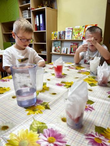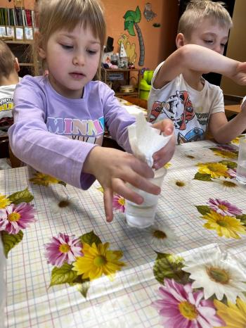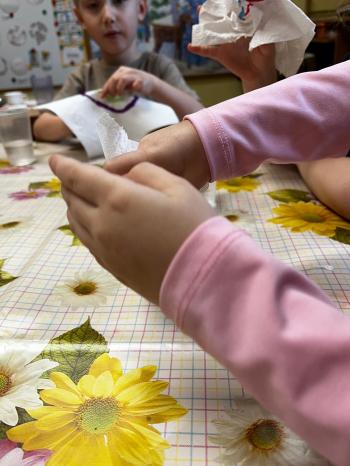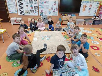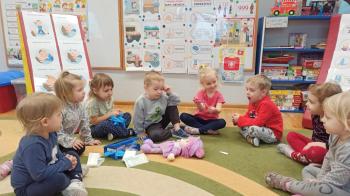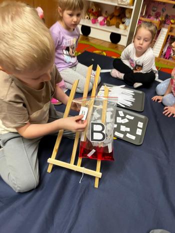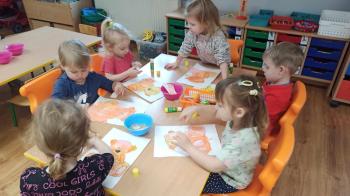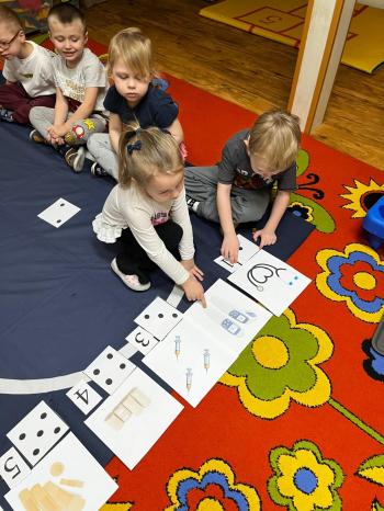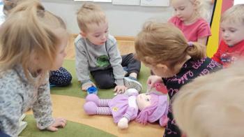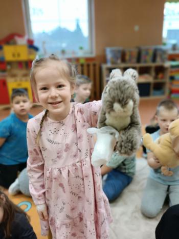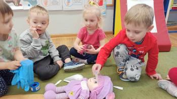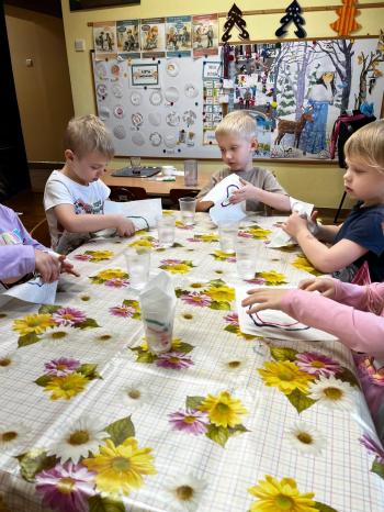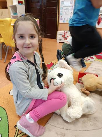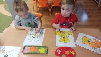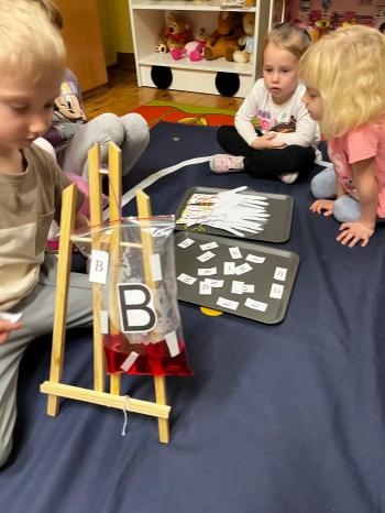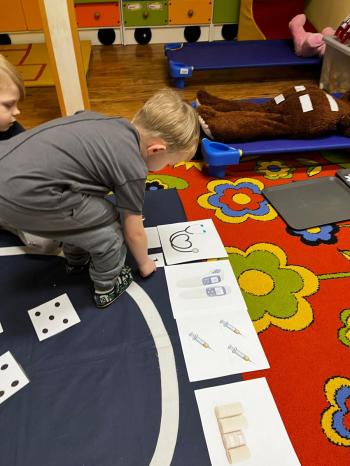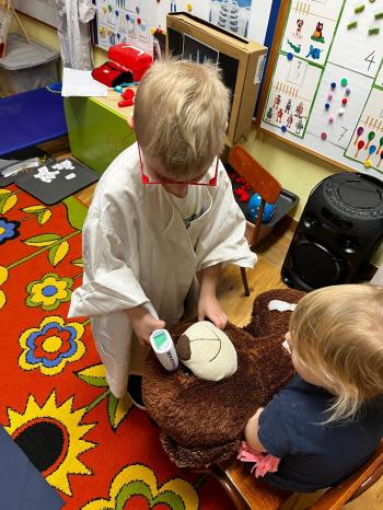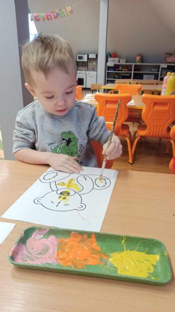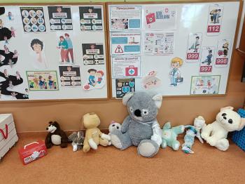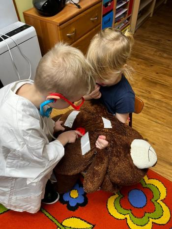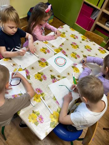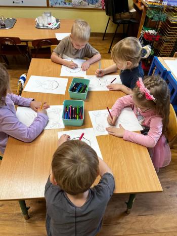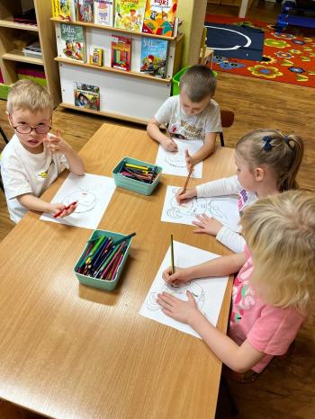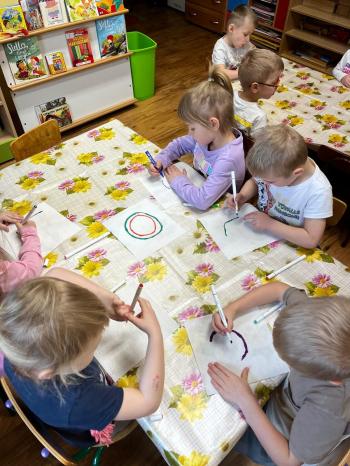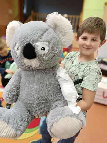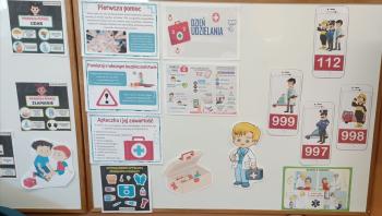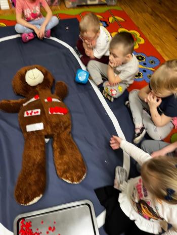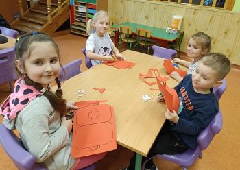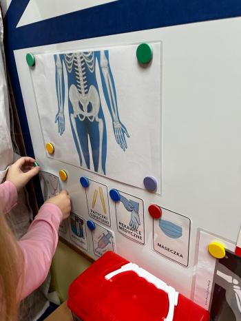 Grupa „Słoneczek” Podczas zajęć plastycznych najmłodsze przedszkolaki przeniosły się do pasjonującego świata medycyny, gdzie ich głównymi bohaterami był chory miś i lalka. „Słoneczka” z zapałem wykonywały prace plastyczne, nadając im kolorowe i radosne oblicze. Każde dziecko miało okazję wykazać się kreatywnością, co sprawiło, że mały pacjent ,,Miś” wyglądał naprawdę wyjątkowo! Dzieci wcieliły się również w rolę małych lekarzy, bawiąc się w diagnostykę. Poprzez zabawę utrwalały podstawowe umiejętności udzielania pierwszej pomocy. Zajęcia były pełne śmiechu i radości, ich celem było wzmocnienie postawy odpowiedzialności i gotowości do udzielenia pomocy potrzebującym. To była nie tylko artystyczna przygoda, ale także ekscytująca nauka. Grupa „Kaczuszek” „Kaczuszki” tego dnia brały udział w zabawach matematycznych rozwijających kompetencje poznawcze takich jak: -"Zagadki" - nauczyciel zadawał dzieciom zagadki związane z pracą lekarza, dzieci odgadywały, odszukiwały obrazek, wieszały go na tablicy. -"Miś uczy się liczyć" - nauczyciel podaje nazwę jednego z różnych przedmiotów związanych z pracą lekarza, dzieci próbowały wskazać je na planszy, przeliczyć, dopasować odpowiednią ilość oczek oraz cyfrę. -"Miś ma ospę" - Dzieci rzucały kostką, liczyły wyrzucone oczka na kostce, pokazywały na palcach ile kropek wyrzuciły, zadaniem dzieci było przykleić taką samą ilość czerwonych pomponów do chorego Misia. -"Pomóż Misiowi zwalczyć anemię" - Dzieci wraz z nauczycielem rozmawiały w kole o tym co oznacza dla nich zdrowie, jak o nie dbają. Przedszkolaki opowiadały o tym co lubią jeść, jak dbają o ząbki lub bawią się na powietrzu. Zastanawiały się nad tym jak można zadbać o zdrowie Misia aby zaczął się czuć dobrze każdego dnia. Dzieci wykonały przetaczanie krwinek czerwonych w celu zwalczenia anemii u Misia. Zachęciły go również do jedzenia większej ilości roślin strączkowych, szpinaku i rukoli w celu uzupełnienia niedoboru żelaza. -"Z wizytą u lekarza" - przedszkolaki przyjęły kolejnego pacjenta który uległ wypadkowi w czasie jazdy na rowerze. Wykonały zdjęcie rtg łapki. Zszyły ranę skóry. Opatrzyły rękę. Każdy z pacjentów został przebadany i pozostawiony w szpitalu na obserwacji. Na zakończenie zajęć dzieci wykonały eksperyment z wodą i chusteczką. W małym szpitalnym laboratorium dzieci obserwowały jak zachowa się chusteczka higieniczna zanurzona w kubeczku z wodą na której wcześniej przedszkolaki namalowały dwa kolorowe koła. Chusteczkami o różnych wzorach i barwach ozdobiły kolorowankę.