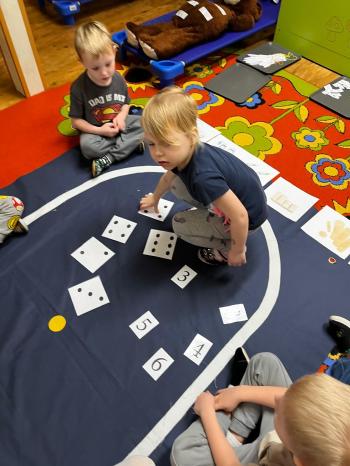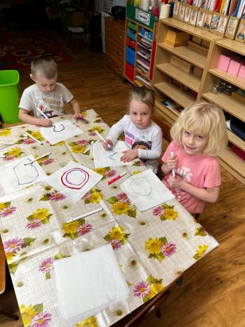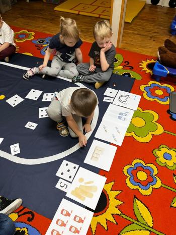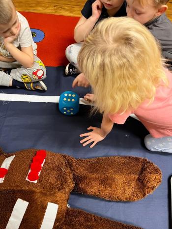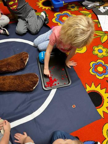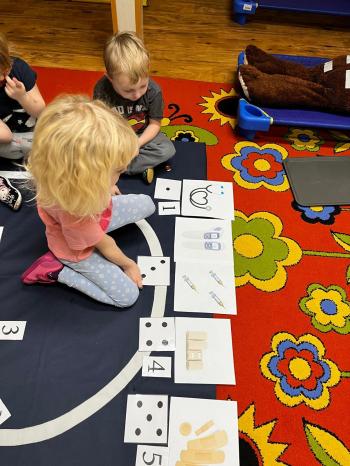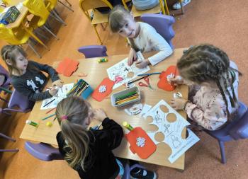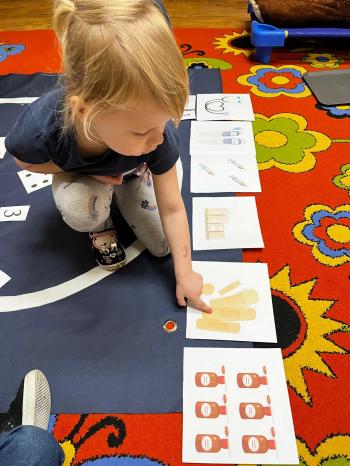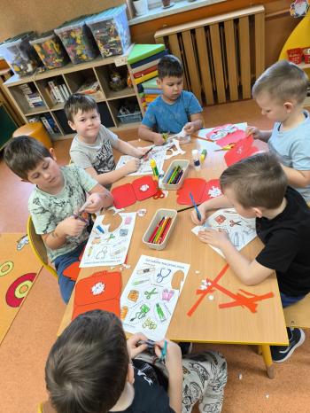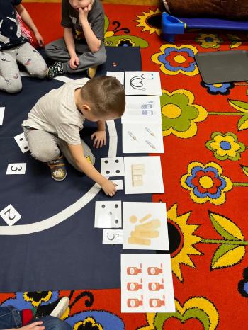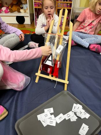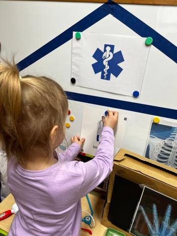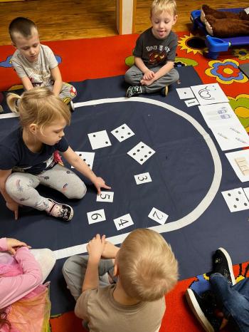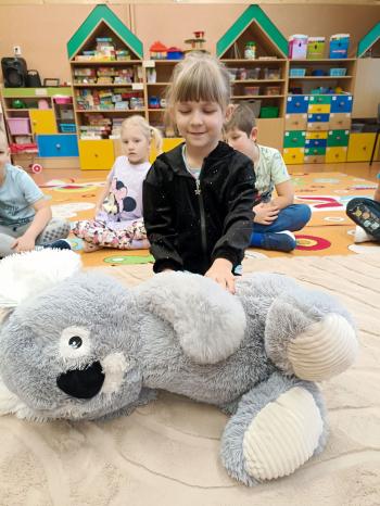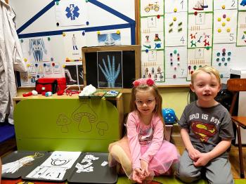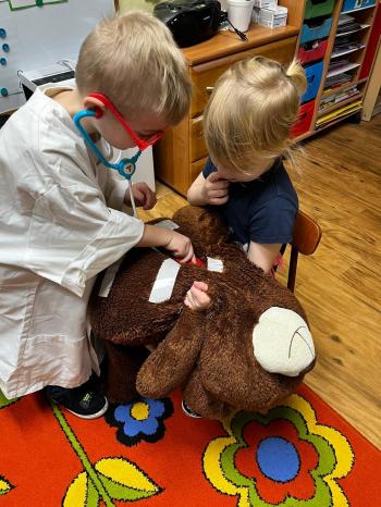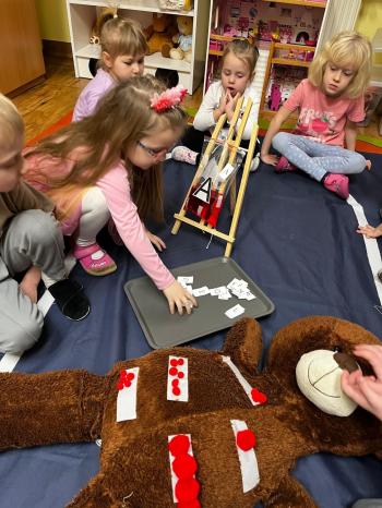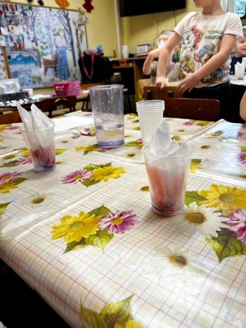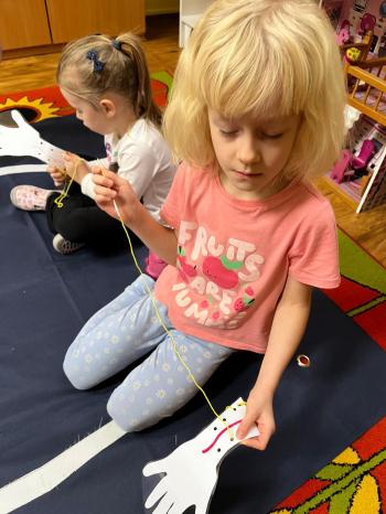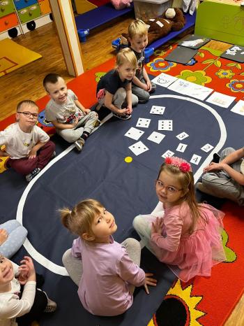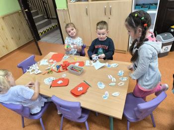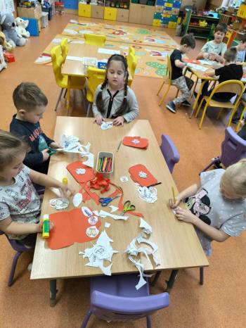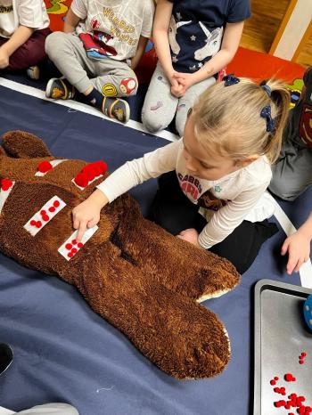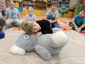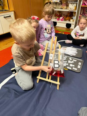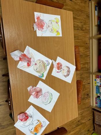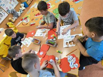 Grupa „Słoneczek” Podczas zajęć plastycznych najmłodsze przedszkolaki przeniosły się do pasjonującego świata medycyny, gdzie ich głównymi bohaterami był chory miś i lalka. „Słoneczka” z zapałem wykonywały prace plastyczne, nadając im kolorowe i radosne oblicze. Każde dziecko miało okazję wykazać się kreatywnością, co sprawiło, że mały pacjent ,,Miś” wyglądał naprawdę wyjątkowo! Dzieci wcieliły się również w rolę małych lekarzy, bawiąc się w diagnostykę. Poprzez zabawę utrwalały podstawowe umiejętności udzielania pierwszej pomocy. Zajęcia były pełne śmiechu i radości, ich celem było wzmocnienie postawy odpowiedzialności i gotowości do udzielenia pomocy potrzebującym. To była nie tylko artystyczna przygoda, ale także ekscytująca nauka. Grupa „Kaczuszek” „Kaczuszki” tego dnia brały udział w zabawach matematycznych rozwijających kompetencje poznawcze takich jak: -"Zagadki" - nauczyciel zadawał dzieciom zagadki związane z pracą lekarza, dzieci odgadywały, odszukiwały obrazek, wieszały go na tablicy. -"Miś uczy się liczyć" - nauczyciel podaje nazwę jednego z różnych przedmiotów związanych z pracą lekarza, dzieci próbowały wskazać je na planszy, przeliczyć, dopasować odpowiednią ilość oczek oraz cyfrę. -"Miś ma ospę" - Dzieci rzucały kostką, liczyły wyrzucone oczka na kostce, pokazywały na palcach ile kropek wyrzuciły, zadaniem dzieci było przykleić taką samą ilość czerwonych pomponów do chorego Misia. -"Pomóż Misiowi zwalczyć anemię" - Dzieci wraz z nauczycielem rozmawiały w kole o tym co oznacza dla nich zdrowie, jak o nie dbają. Przedszkolaki opowiadały o tym co lubią jeść, jak dbają o ząbki lub bawią się na powietrzu. Zastanawiały się nad tym jak można zadbać o zdrowie Misia aby zaczął się czuć dobrze każdego dnia. Dzieci wykonały przetaczanie krwinek czerwonych w celu zwalczenia anemii u Misia. Zachęciły go również do jedzenia większej ilości roślin strączkowych, szpinaku i rukoli w celu uzupełnienia niedoboru żelaza. -"Z wizytą u lekarza" - przedszkolaki przyjęły kolejnego pacjenta który uległ wypadkowi w czasie jazdy na rowerze. Wykonały zdjęcie rtg łapki. Zszyły ranę skóry. Opatrzyły rękę. Każdy z pacjentów został przebadany i pozostawiony w szpitalu na obserwacji. Na zakończenie zajęć dzieci wykonały eksperyment z wodą i chusteczką. W małym szpitalnym laboratorium dzieci obserwowały jak zachowa się chusteczka higieniczna zanurzona w kubeczku z wodą na której wcześniej przedszkolaki namalowały dwa kolorowe koła. Chusteczkami o różnych wzorach i barwach ozdobiły kolorowankę.