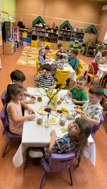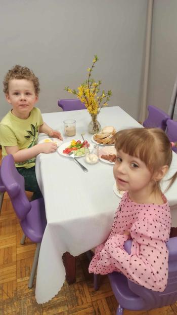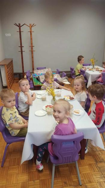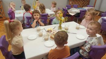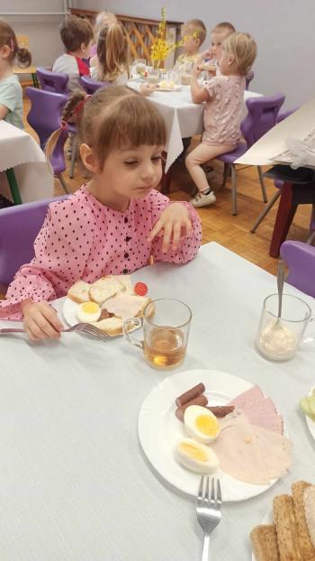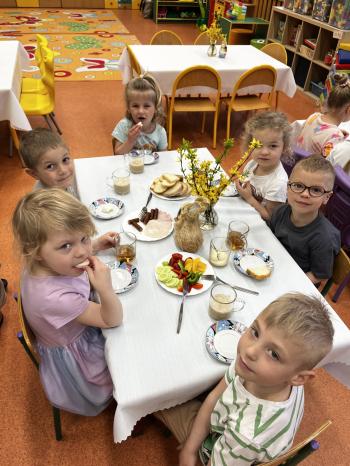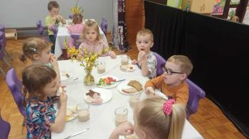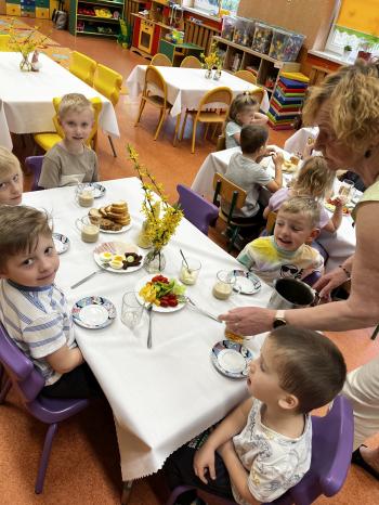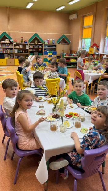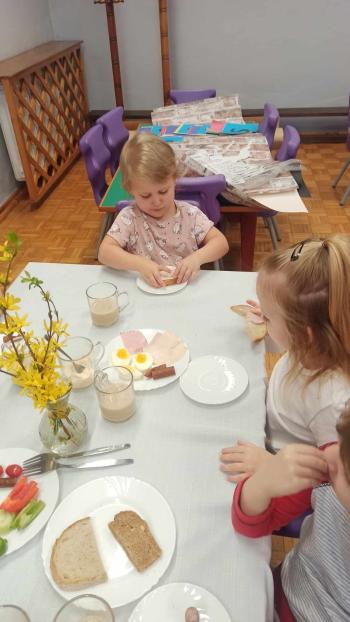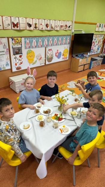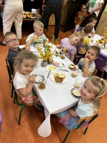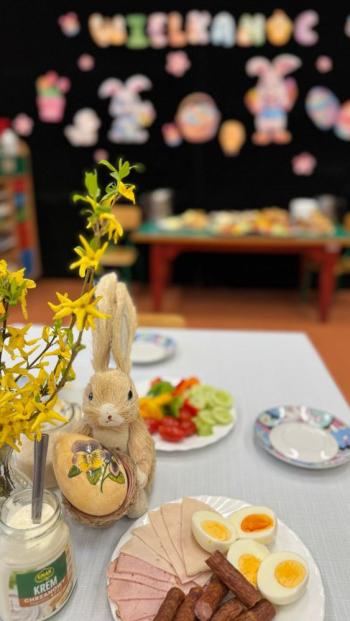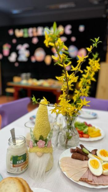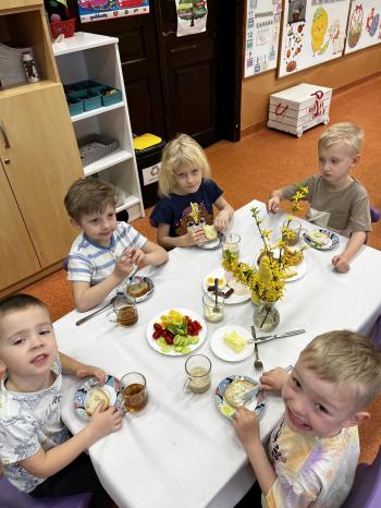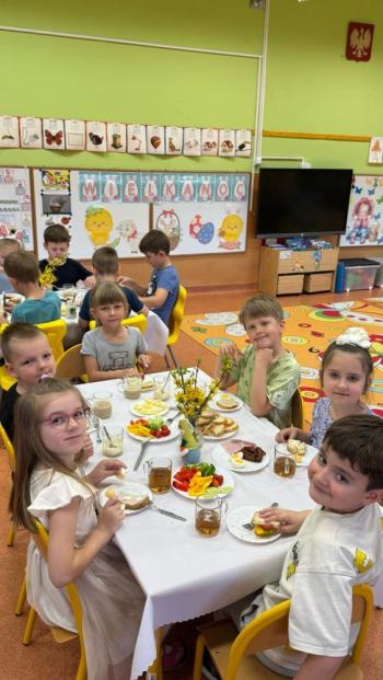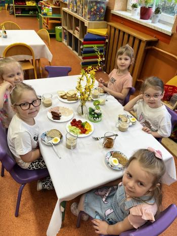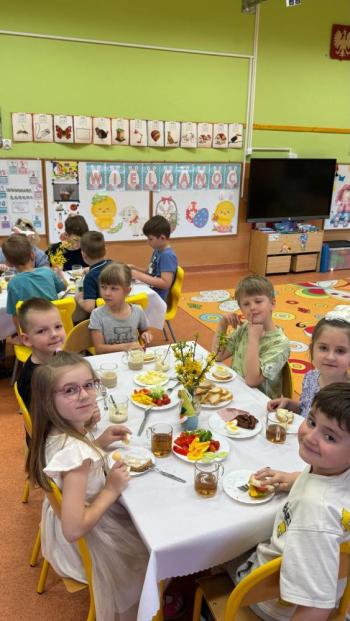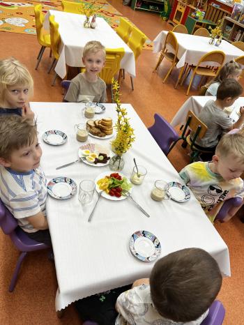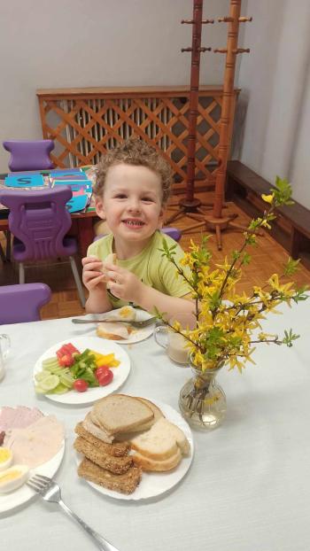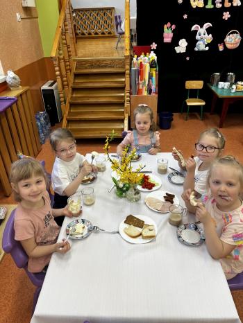 W naszym przedszkolu 17 kwietnia dzieci z grupy „Słoneczek”, „Kaczuszek” oraz „Żabek” usiadły przy świątecznie przystrojonych stołach do uroczystego wielkanocnego śniadania, które miało charakter „szwedzkiego  stołu”. Rozpoczęło się ono od złożenia życzeń wielkanocnych. Ta uroczystość nawiązywała do polskiej tradycji i miała na celu wzmacnianie więzi społecznej i rodzinnej.