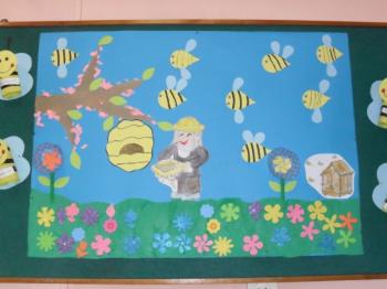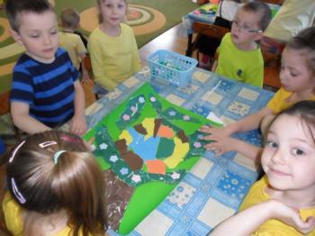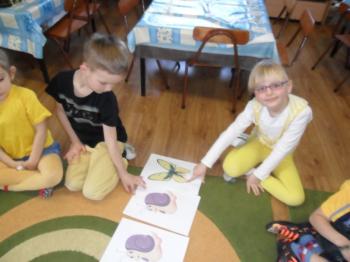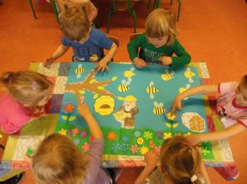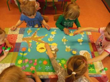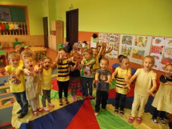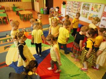 Następnie przedszkolaki odnajdywały wymienione kolory na chuście animacyjnej i podsumowały wiadomości zdobyte na temat życia pszczół.