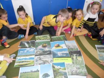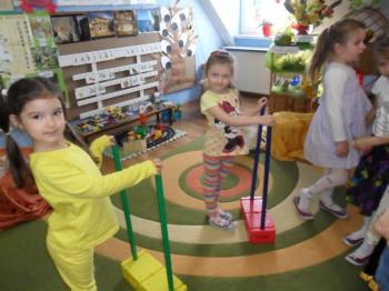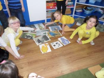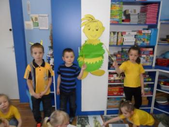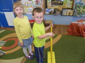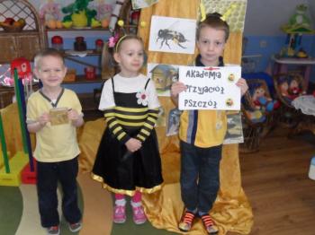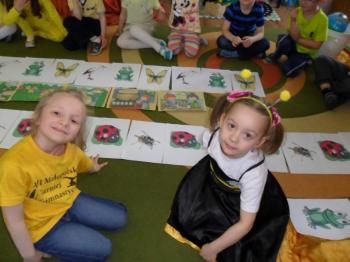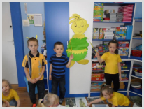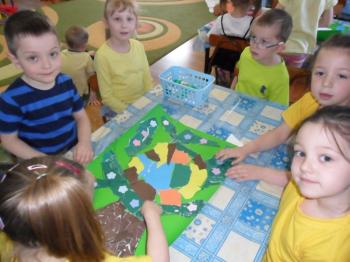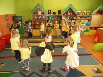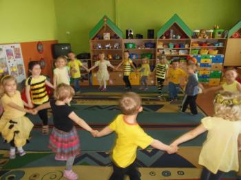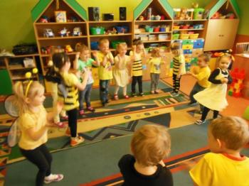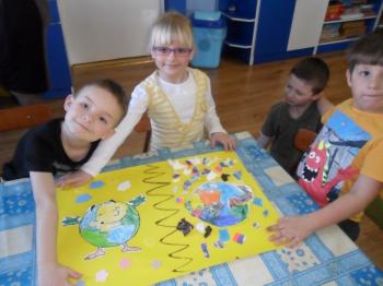 Na początku zajęć dzieci z oddziału „Słoneczek” powitały się zabawą pt. "Wesołe pszczółki" podczas, której zatrzymywały się na przerwę w muzyce przybierając śmieszne pozy, a następnie próbowały dokończyć zdanie „Nasza Planeta Ziemia jest...”.