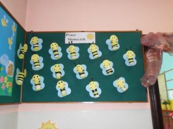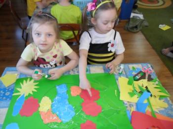 Następnie pokonywały przeszkody - przejście przez plotki, skoki do obręczy, rzuty piłką, układały puzzle zwierzątek, wysłuchały wiersza M.Terlikowskiej „Halo Ziemia”- układały obrazki na kuli ziemskiej, która była wesoła i smutna, a następnie dzieci pracowały w zespołach tworząc Eko – plakaty. Na koniec zajęć wspólnie bawiły się przy dźwiękach piosenki pt. „Pszczoły”.
