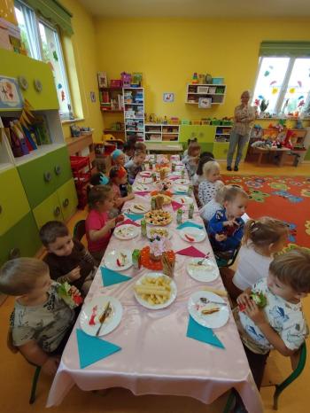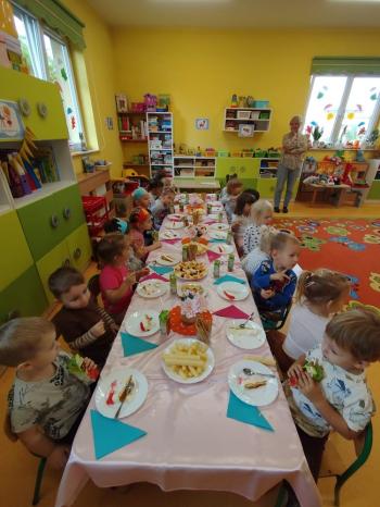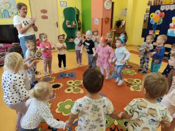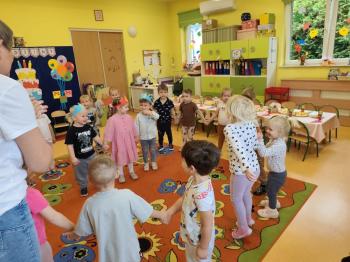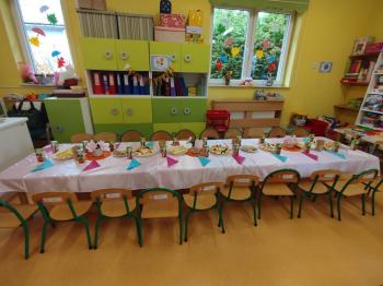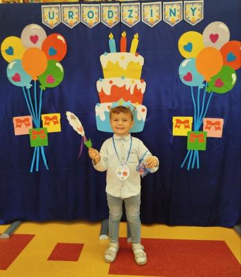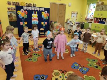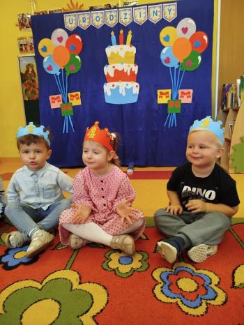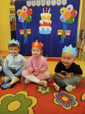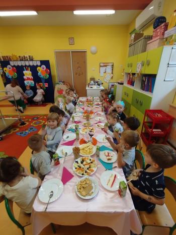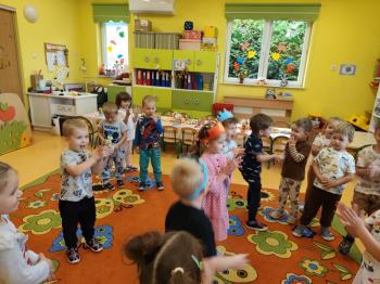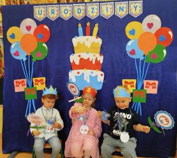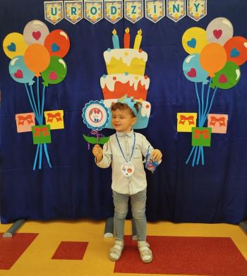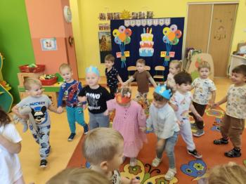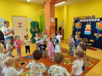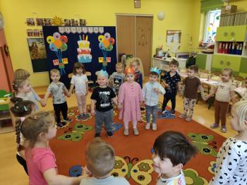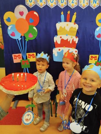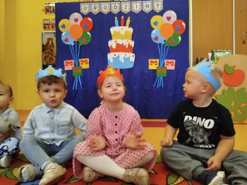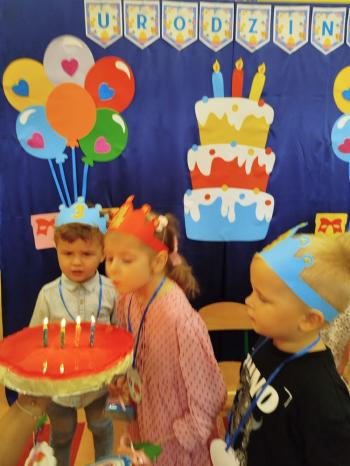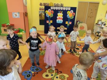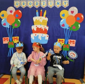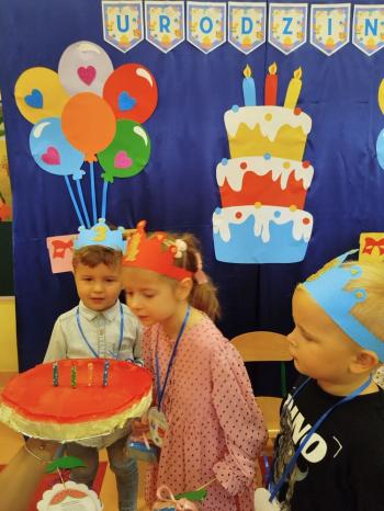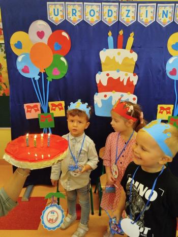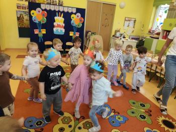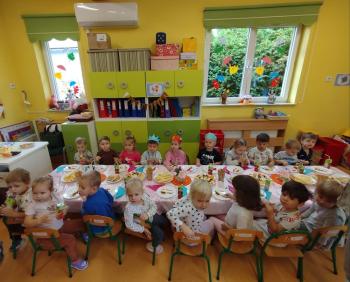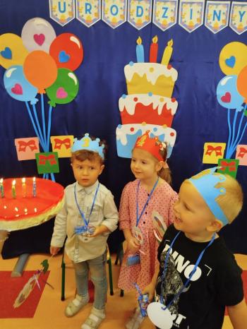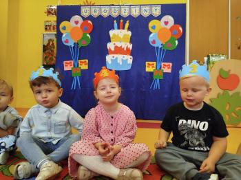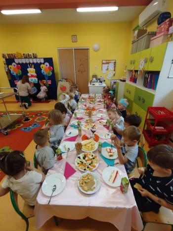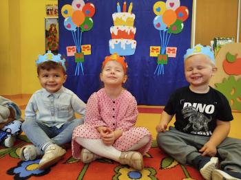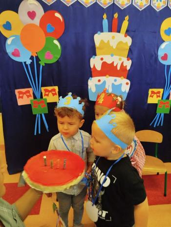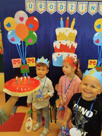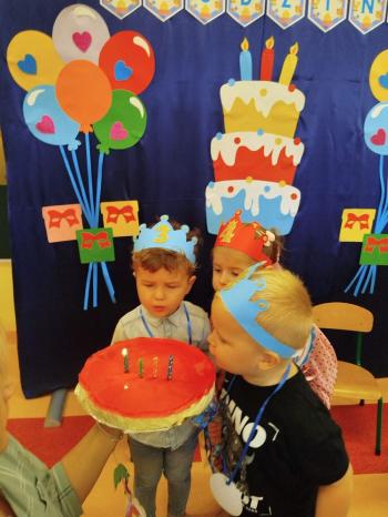W tym miesiącu obchodziliśmy urodzinki Bruna oraz Michalinki i Stasia. Przedszkolaki złożyły solenizantom życzenia płynące z serduszek i zaśpiewały gromkie 100 lat. Jak przystało na urodzinki, każdy z solenizantów otrzymał medal, laurkę z życzeniami oraz drobny upominek. Świeczki na torcie zostały zdmuchnięte i wszyscy zasiedliśmy do stołu biesiadnego, bardzo suto zastawionego dzięki naszym cudownym Rodzicom, którzy dostarczyli nam moc smakowitych przekąsek.