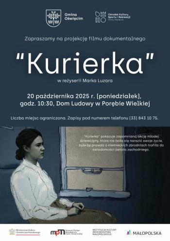 Serdecznie zapraszamy na projekcję filmu dokumentalnego „Kurierka” w reżyserii Marka Luzara, która odbędzie się 20 października 2025 r. (poniedziałek) o godz. 10:30 w Domu Ludowym w Porębie Wielkiej.
