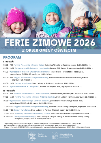 Zapraszamy dzieci z gminy Oświęcim w wieku szkolnym do udziału w zajęciach i wycieczkach w terminie 02.02-15.02.2026 w ramach Ferii 2026 z Ośrodkiem Kultury, Sportu i Rekreacji Gminy Oświęcim.