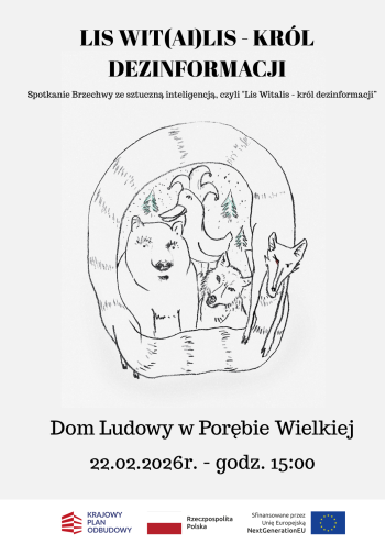 Informacje o projekcie: Spektakl powstał w ramach przedsięwzięcia pt. „Spotkanie Brzechwy ze sztuczną inteligencją, czyli Lis Witalis – Król Dezinformacji” (nr wniosku: 4119/KPO.GRANTY 2025). Sfinansowane przez Unię Europejską NextGenerationEU. Przedsięwzięcie realizowane w ramach Krajowego Planu Odbudowy i Zwiększania Odporności. Komponent: Odporność i konkurencyjność gospodarki; Inwestycja A2.5.1: Program wspierania działalności podmiotów sektora kultury i przemysłów kreatywnych na rzecz stymulowania ich rozwoju.