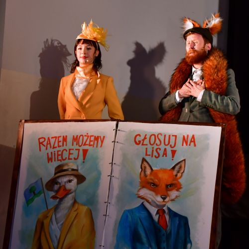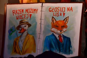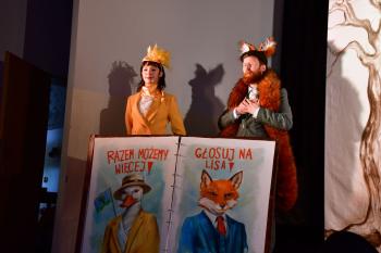 Widowisko było niezwykle interaktywne – dzieci aktywnie uczestniczyły w fabule, pomagały bohaterom odkrywać prawdę , a nawet głosowały w wyborach na prezydenta lasu! Nikczemny lis próbował nawet je przekupić, rzucając ze sceny cukierkami!