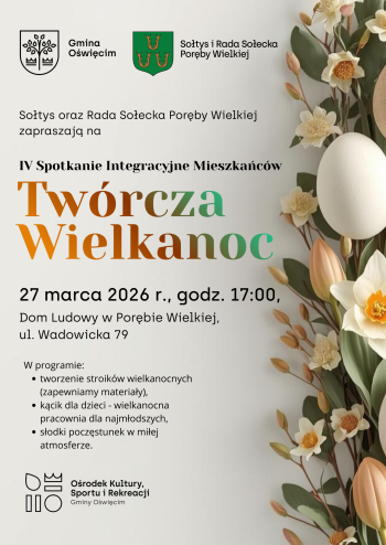Sołtys i Rada Sołecka Poręby Wielkiej zaprasza wszystkich mieszkańców na IV Spotkanie Integracyjne Mieszkańców: „Twórcza Wielkanoc”, które odbędzie się 27 marca br., w Domu Ludowym w Porębie Wielkiej.