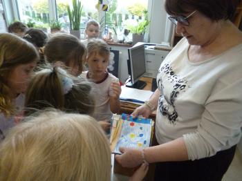 Na zakończenie każdy uczestnik otrzymał zakładkę do książki oraz zachętę do regularnych odwiedzin biblioteki szkolnej. Dzieci również miały dla pani bibliotekarki miłą niespodziankę wręczając jej swoje prace plastyczne, a mianowicie zaprojektowane okładki książek, które chciałyby przeczytać. Spotkanie przebiegło w miłej atmosferze i z pewnością przyczyniło się do wzrostu zainteresowania czytaniem wśród najmłodszych uczniów.