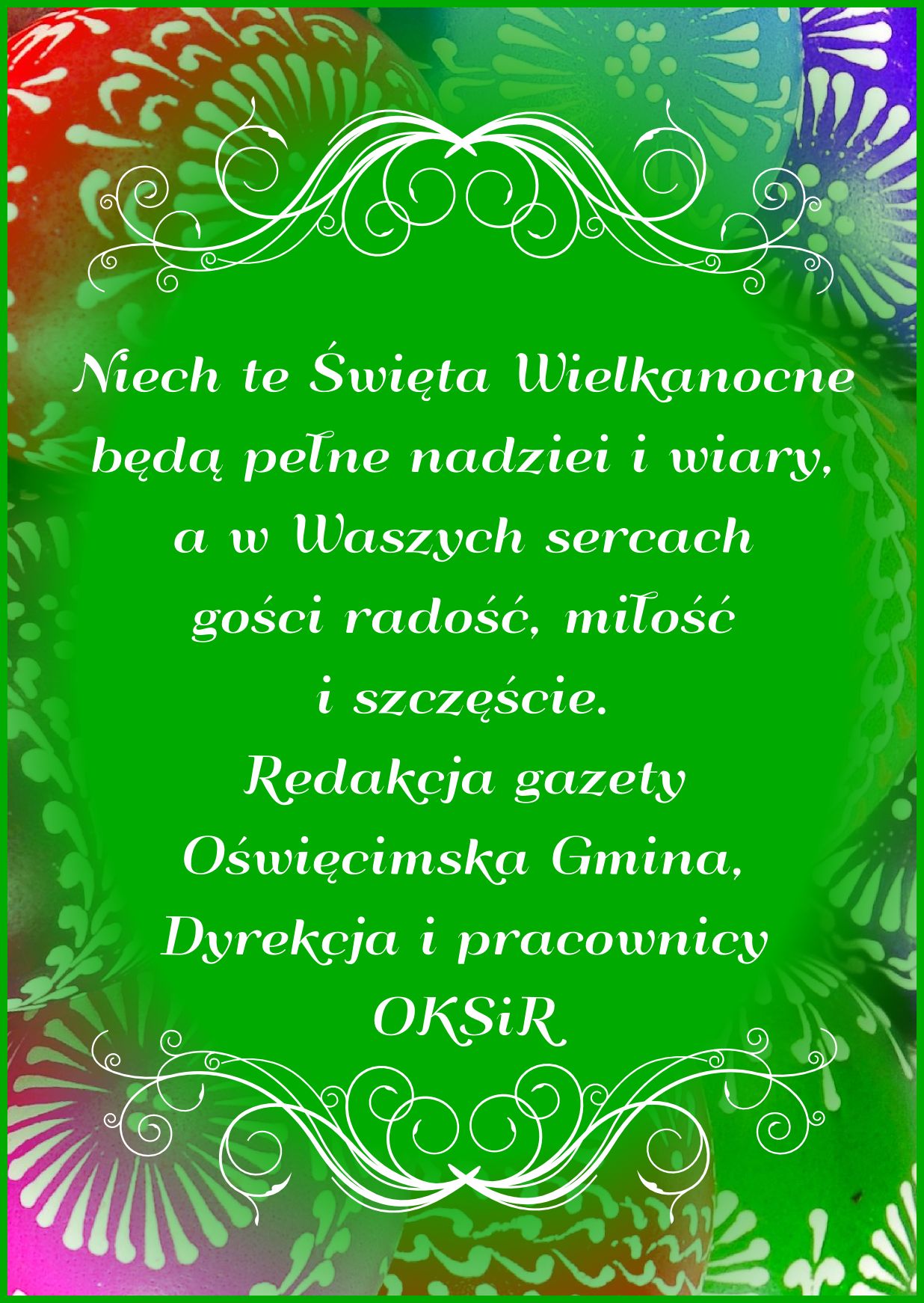 Redakcja gazety Oświęcimska Gmina wraz z Dyrekcją i pracownikami Ośrodka Kultury, Sportu i Rekreacji Gminy Oświęcim pragną Państwu złożyć życzenia...